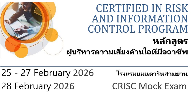 CRISC Program #1/2026 สถานะหลักสูตร: เปิด 25 กุมภาพันธ์ 9:00 am - 27 กุมภาพันธ์ 4:00 pm โรงแรมแมนดาริน สามย่าน 662 ถนนพระรามที่ 4 แขวงมหาพฤฒาราม, เขตบางรัก, กรุงเทพมหานคร, Thailand