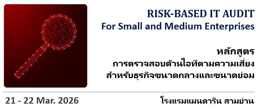 Risk-based IT Audit for Small and Medium Enterprise สถานะหลักสูตร: เปิด 21 มีนาคม 9:00 am - 22 มีนาคม 4:00 pm โรงแรมแมนดาริน สามย่าน 662 ถนนพระรามที่ 4 แขวงมหาพฤฒาราม, เขตบางรัก, กรุงเทพมหานคร, Thailand