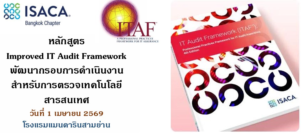 Improved IT Audit Framework พัฒนากรอบการดำเนินงานสำหรับการตรวจเทคโนโลยี สถานะหลักสูตร: เปิด 1 เมษายน โรงแรมแมนดาริน สามย่าน 662 ถนนพระรามที่ 4 แขวงมหาพฤฒาราม, เขตบางรัก, กรุงเทพมหานคร, Thailand