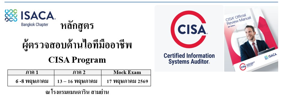 CISA Program Part 1 [#2/2026] ผู้ตรวจสอบด้านไอทีมืออาชีพ ภาค 1 สถานะหลักสูตร: เปิด 6 พฤษภาคม 9:00 am - 8 พฤษภาคม 4:00 pm โรงแรมแมนดาริน สามย่าน 662 ถนนพระรามที่ 4 แขวงมหาพฤฒาราม, เขตบางรัก, กรุงเทพมหานคร, Thailand